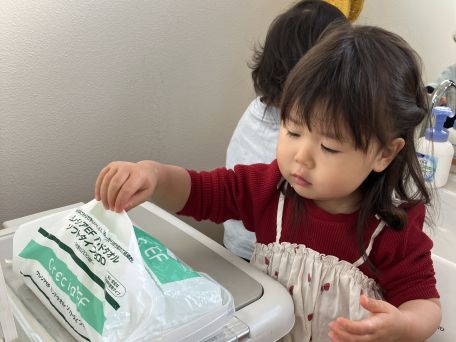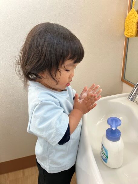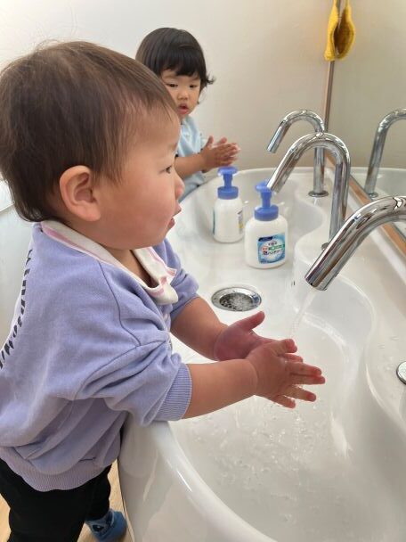 手洗いの後には、綺麗になった手を自慢げに保育士に見せてくれる子もいます😄
