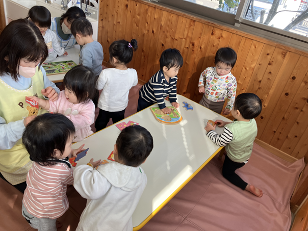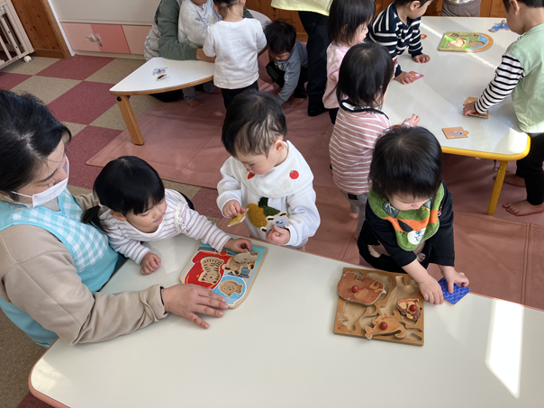 まだまだ絵と同じものを合わせることは難しい子どもの方が多いですが、動物の名前を言ったり指さしたり、自分なりにはめようとしたりとしばらく盛り上がっていました。