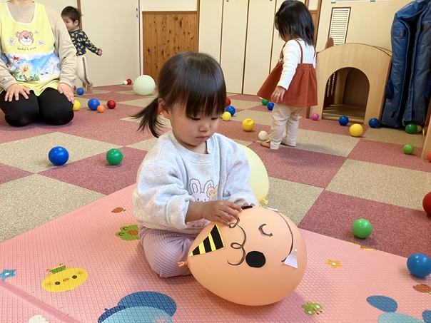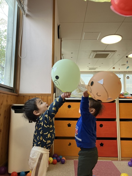 子どもたちは、風船遊びが大好きで、風船鬼と遊んだり、吊るされた風船鬼にカラーボールを当てたりして楽しみました。