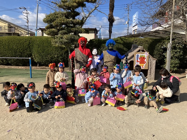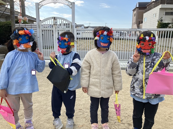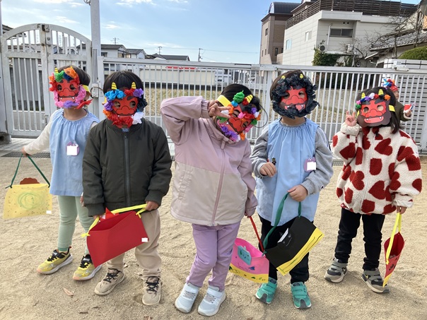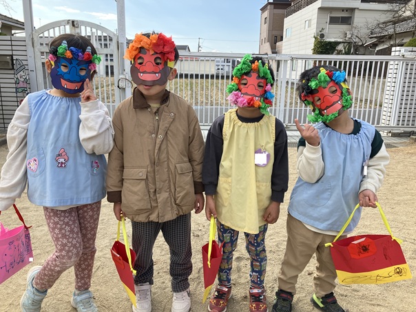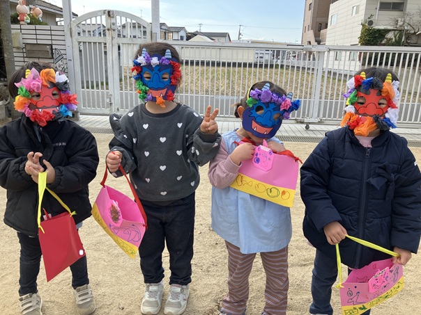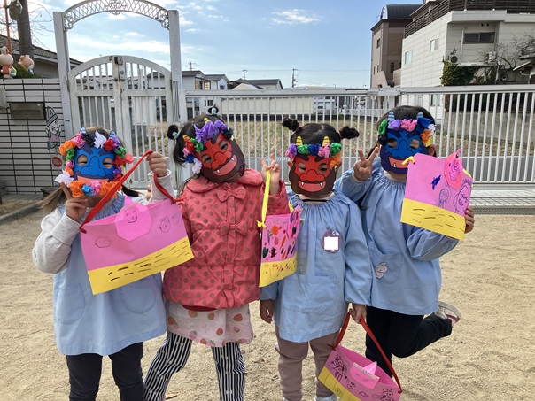 今日は園庭で遊んだ後、鬼の面をつけ記念撮影。誰だかわかりますか?