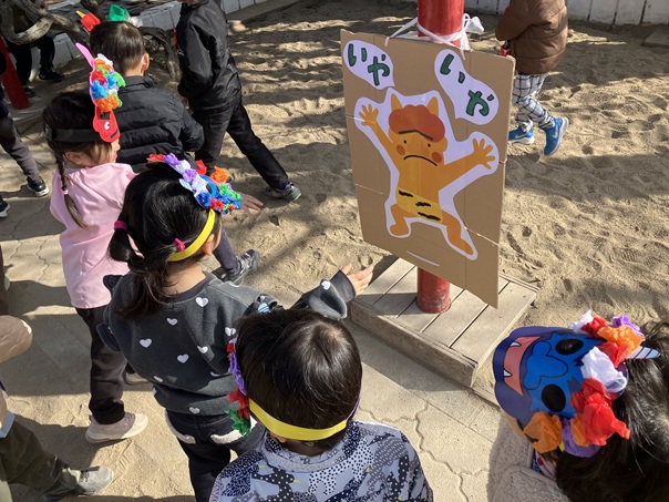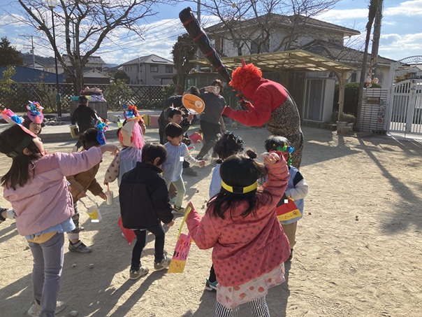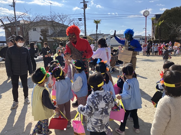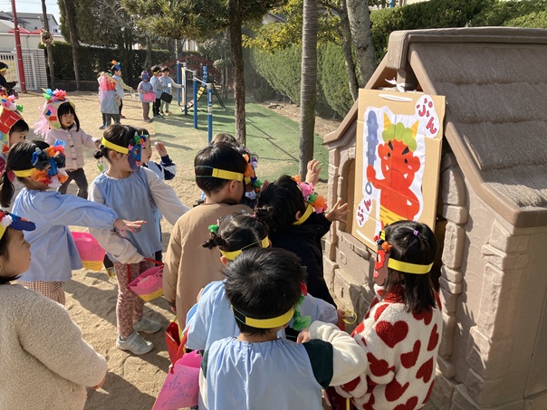 福の神と一緒に赤鬼と青鬼は遠くの山に帰っていきました。「今年は泣かずに豆を投げたよ。」と頼もしい声も聞こえました。去年とはまた少し成長した姿を見せたちゅうりっぷ組さんでした。