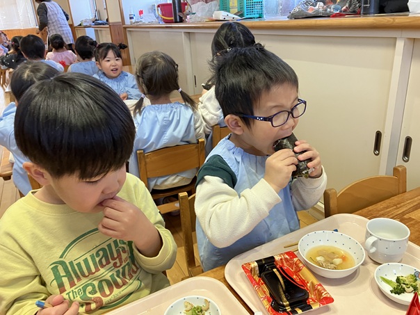 給食は、恵方巻をガブリ!今年も健康で過ごせますように…。
