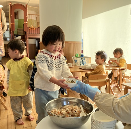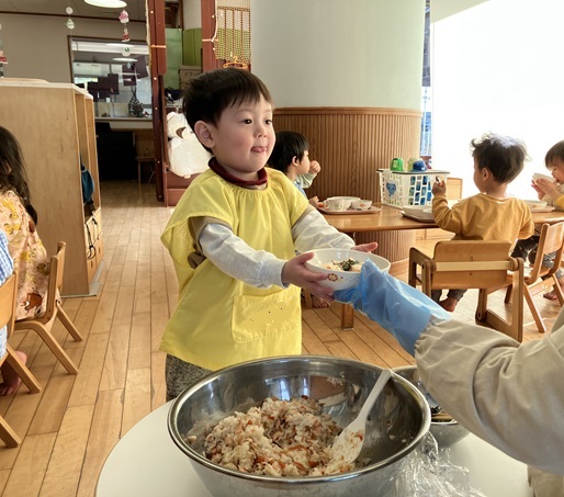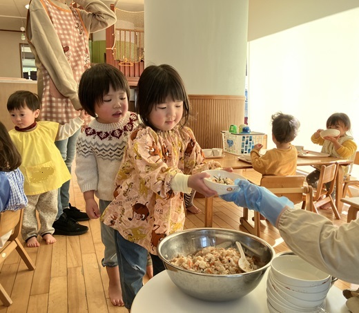 初めての経験にドキドキしながらも、自分で「ちょっと」「ふつう」「いっぱい」などと伝えていた子ども達。保育士の「このくらいかな?」「もう少し食べる?」「もう少し減らす?」等の声掛けに、頷いたり首を振ったりしながら自分の食べたい量を盛ってもらい、両手でしっかりとお茶碗を持って席まで運んでいました。