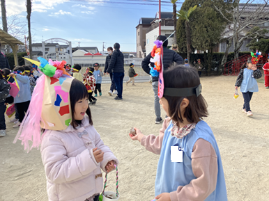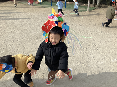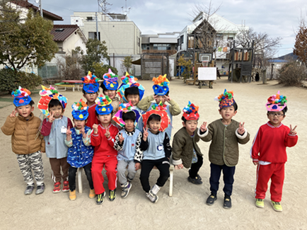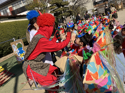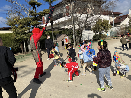 節分集会に参加しました。「おにはーそと ふくはーうち」と子ども達の元気な声が園庭に響きました。