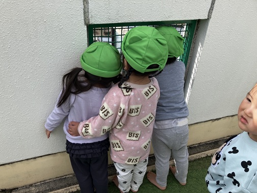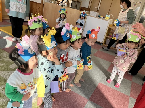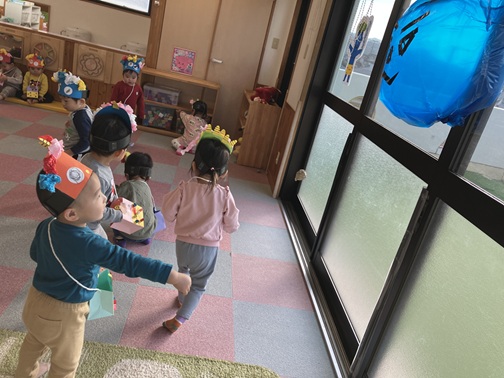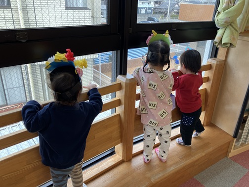 ウッドデッキではたんぽぽ組が、園庭では以上児クラスが豆まきをしていたので部屋やベランから様子を見ました👀遠くに見える鬼に、「おにーー!!」と興奮する子もいれば、少し怖そうにする子もいました。