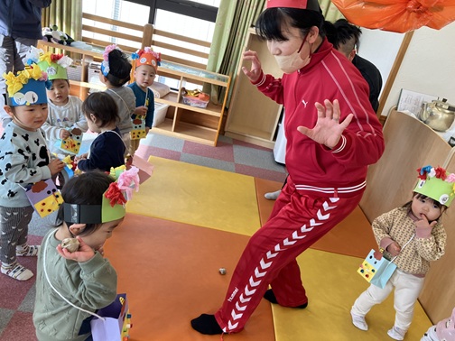 鬼に変装した先生が登場!みんな、先生だと分かっているので怖がることなく追いかけたり豆を投げたりしていました。