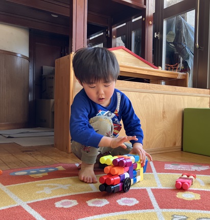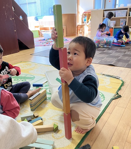 木の積み木コーナーでは、「ここでいいかな?🤔」と、慎重に木の積み木を積んだり…。