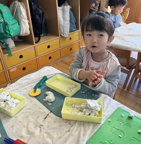 粘土コーナーでは、「お弁当作ってるんだ~😄」と、粘土ケースの蓋をお弁当箱にしてお弁当作りをしたり…。