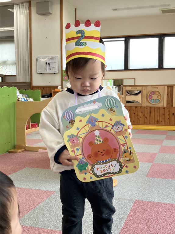 保育士から冠とメッセージカードをプレゼントして貰うと、冠を気に入り、お誕生日会が終わるまで被っていました👑