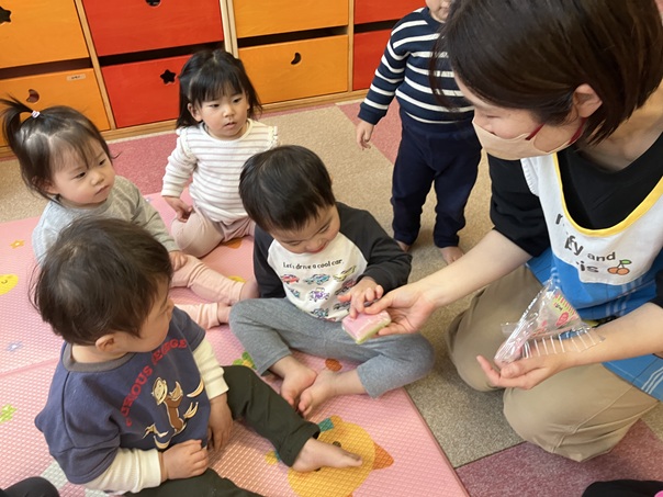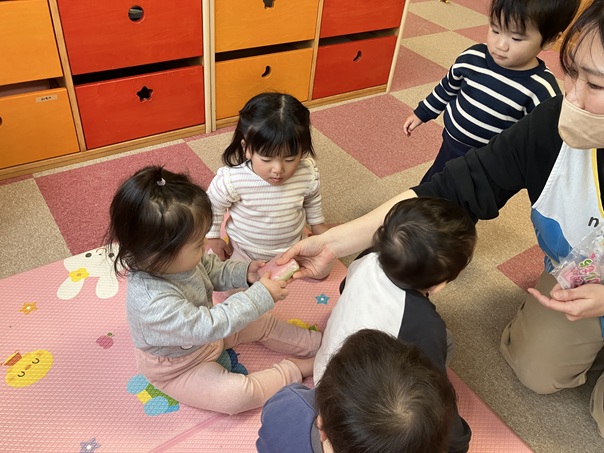 今日はひなまつりということでみんなで菱餅に触れてみました。