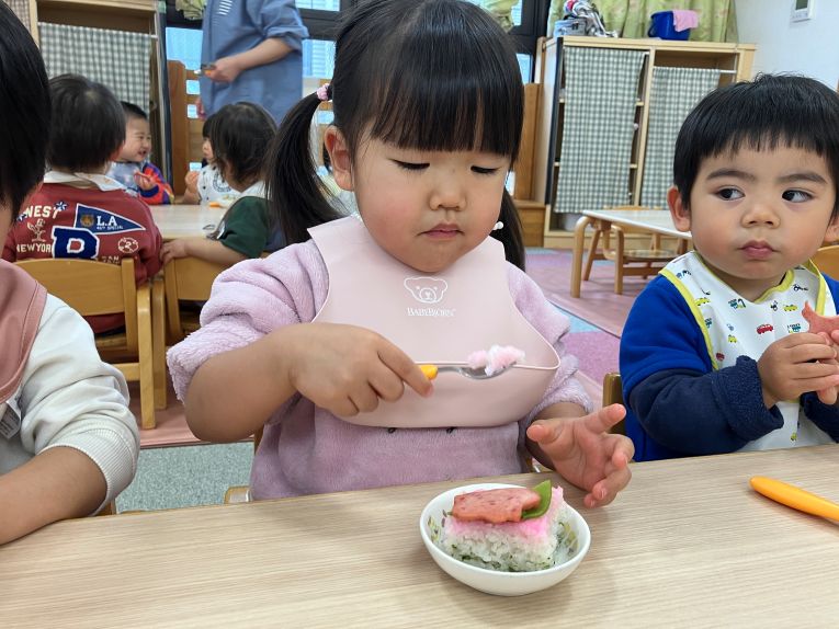 とってもカラフルで美味しそうなお寿司を見ると、「かわいい~」と言ったり、「これはなんだろう?」とご飯の上に乗っているハムや色のついたご飯を指さしたりして保育士に質問していました。