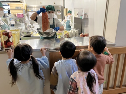 保育園に来る楽しみの1つは、給食🥄。今日は、3グループに分かれて給食の先生のお仕事を見に、給食室まで探検に行きました。