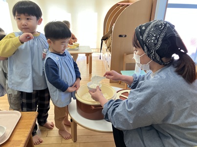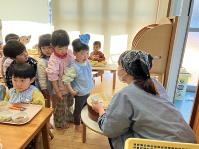 給食の時間には、給食の先生がご飯の配膳に来てくれました。いつもは担任が行っているのですが、給食の先生という特別感が子ども達の食欲をアップさせていました。いつもは「ちょっと。」とご飯の量を少量にする子も、今日は「いっぱい!」と給食の先生に伝えていました。
