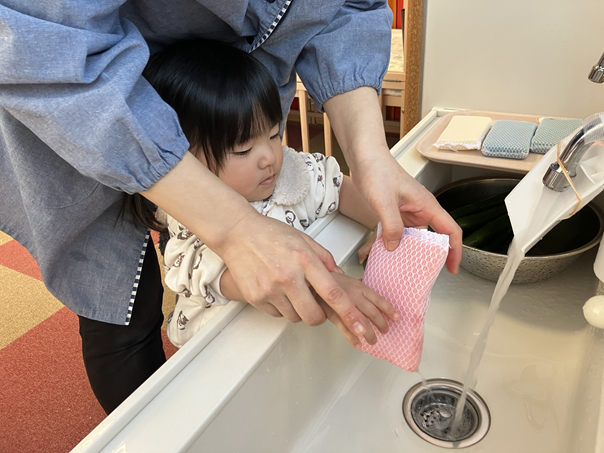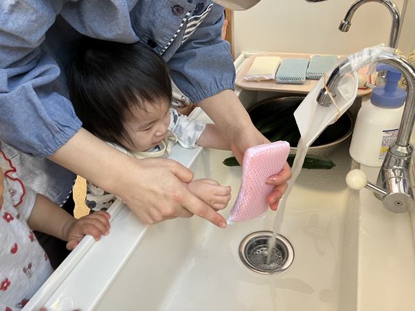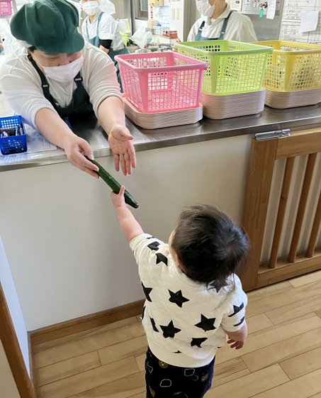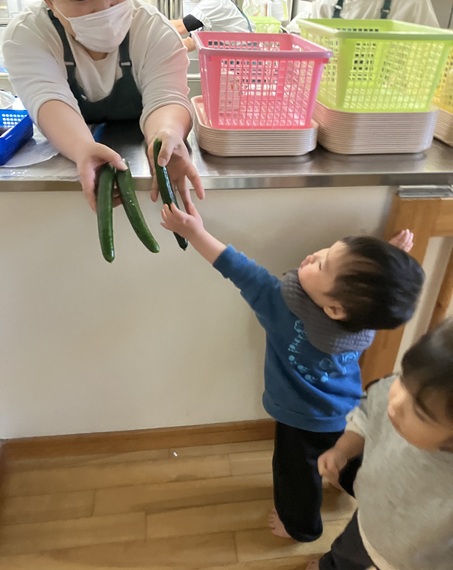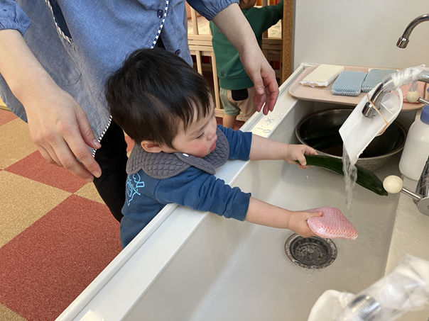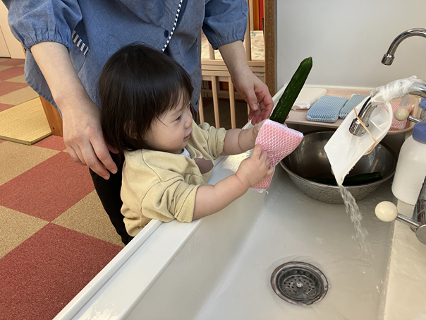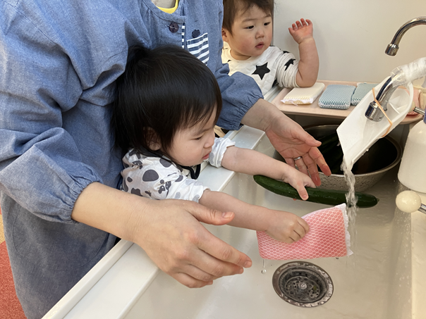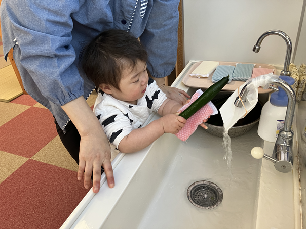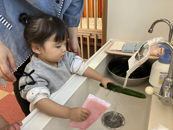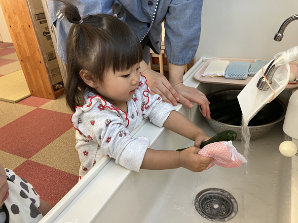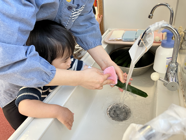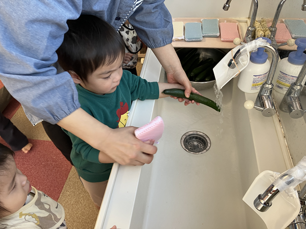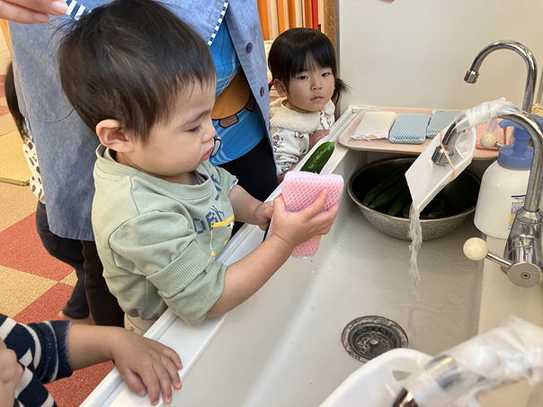 きゅうりを触った時は、「なに、これ。」というような表情の子ども、「自分でぜんぶやる!」とやる気な子ども、「あんまり触りたくないなぁ…」という反応の子どもと様々でしたが、保育士と一緒にきれいに洗うことができました✨