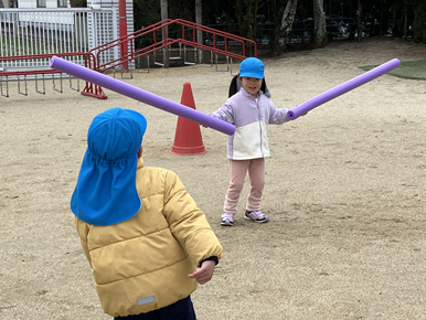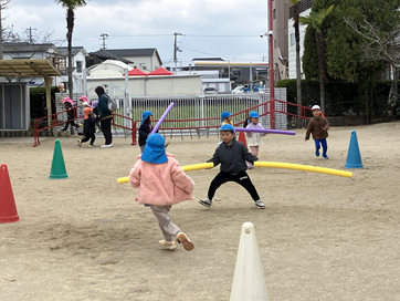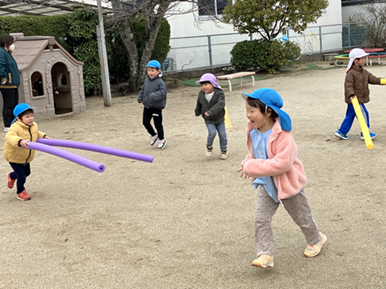 門番を交代しながら 体を沢山動かして楽しんでいます。ひまわり組さんに色々教えて貰いながら色々な遊びを楽しんでいる子ども達です。