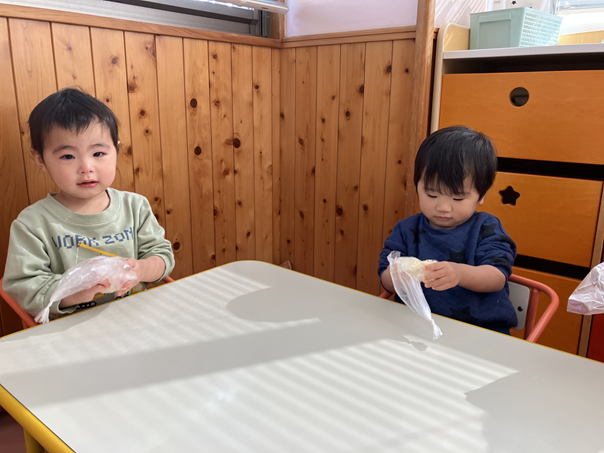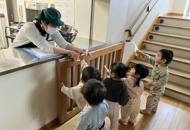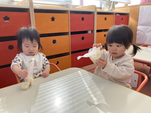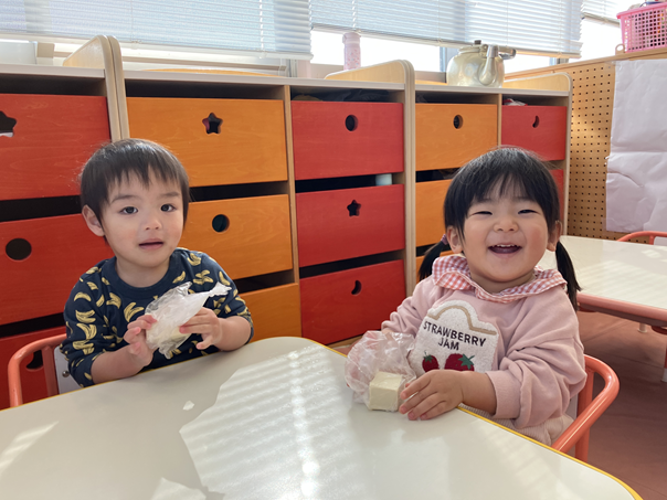 保育士と一緒に全ての豆腐をつぶし、給食室へ届けました💕
