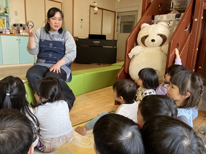 れんこんを持ち上げると穴から水が出てくることに気づき、「せんせ~みずが💦」と水が出ることを楽しむ子もいました。