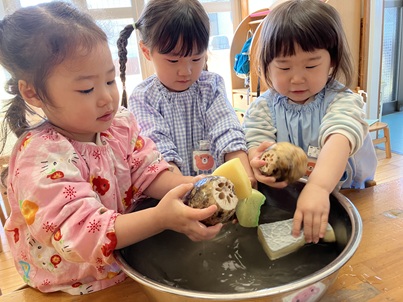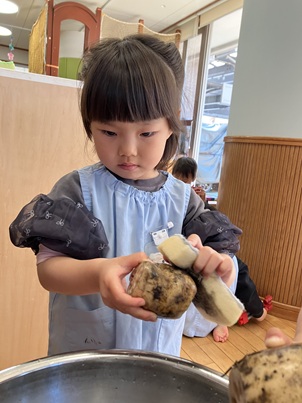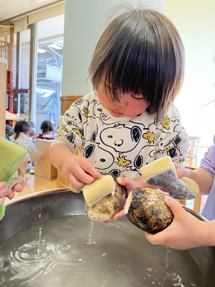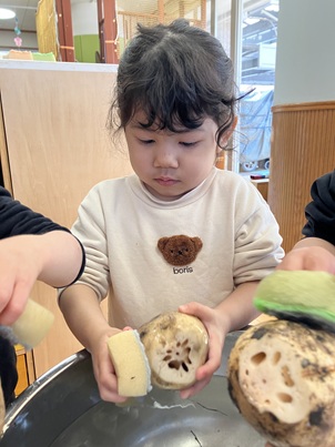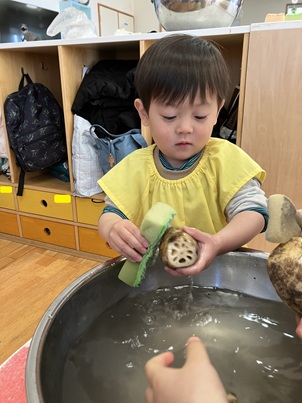 数人ずつ、自分の手の大きさほどのれんこんをボウルの中でゴシゴシ。土がどんどん取れると「きれいになってる!」と嬉しそうにれんこんを保育士に見せていました。