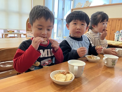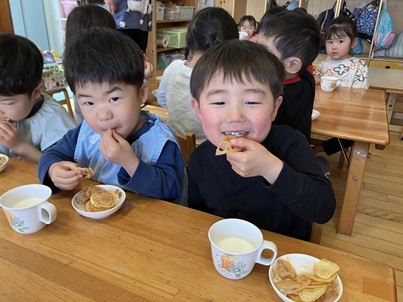 みんながゴシゴシきれいに洗ったれんこんは、今日のおやつの野菜チップスに。「おいし~😋」とパクパク食べていました。