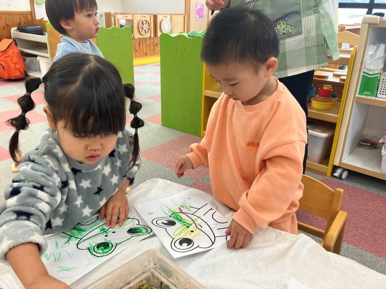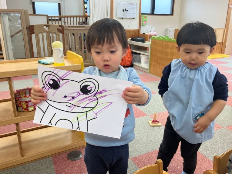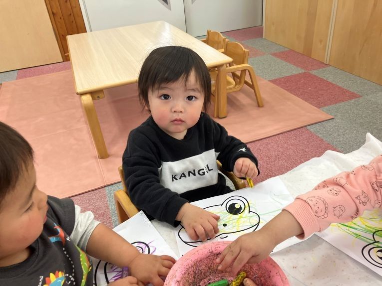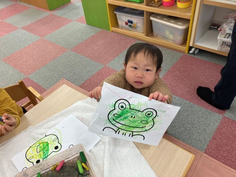 今日は、おたのしみ会で身に付けるカエルのお面制作をしました!