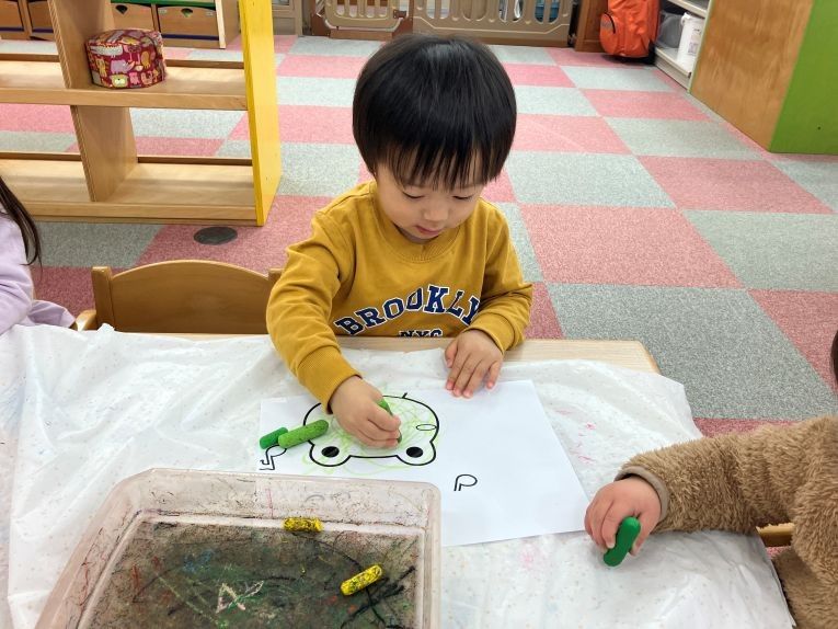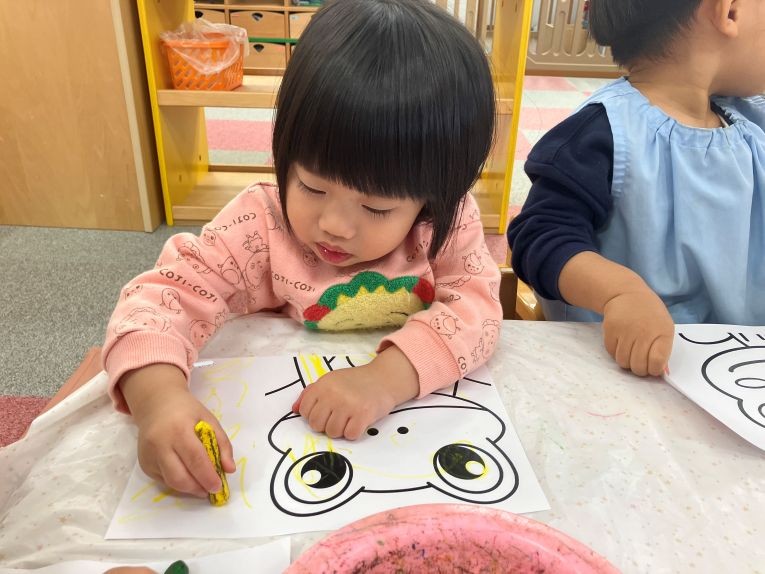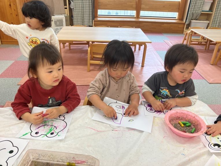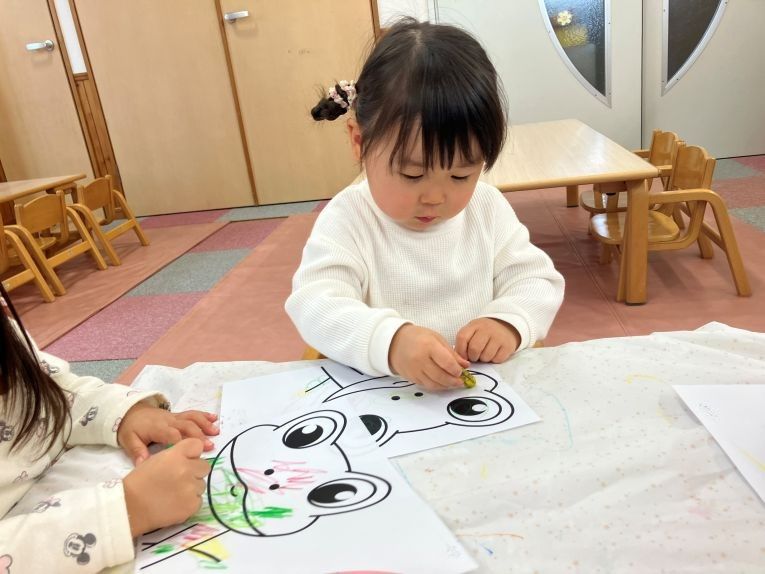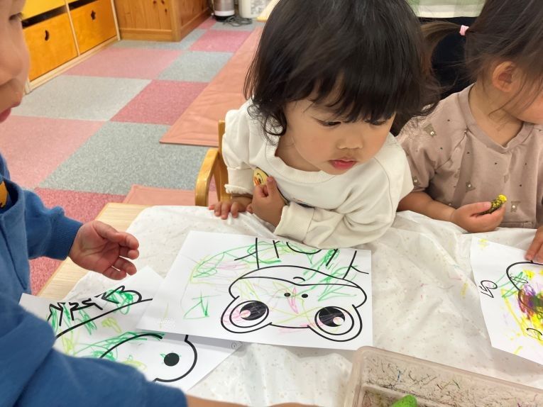 クレヨンを手に持ってグルグルと円を描いたり、線を描いたりと様々な色を使い分けながら一人一人がお面制作を楽しんでいました。