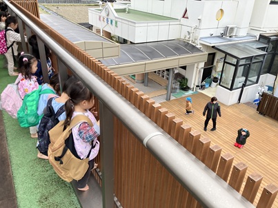 2階にはベランダが!外に出てみるとよく遊んでいるウットデッキが見えました。今日はすみれ組さんが遊んでおり、上から「お~い👋」と手を振っていました。