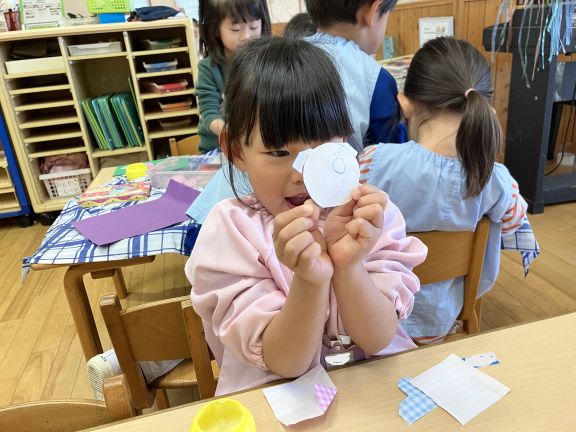 すみれ組さんが季節の制作で切り紙遊びをしていると・・・