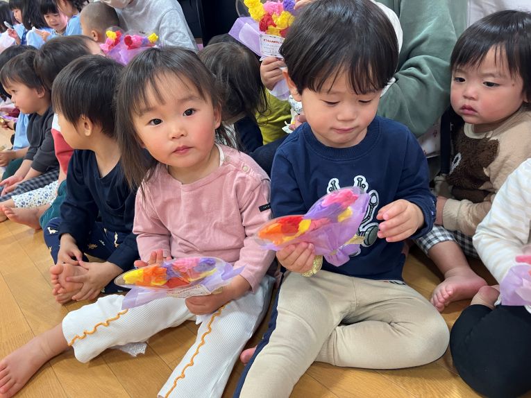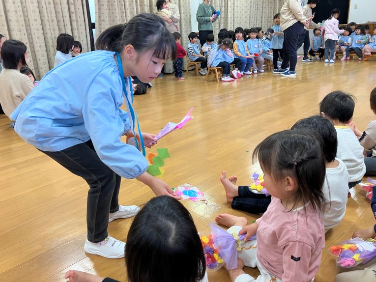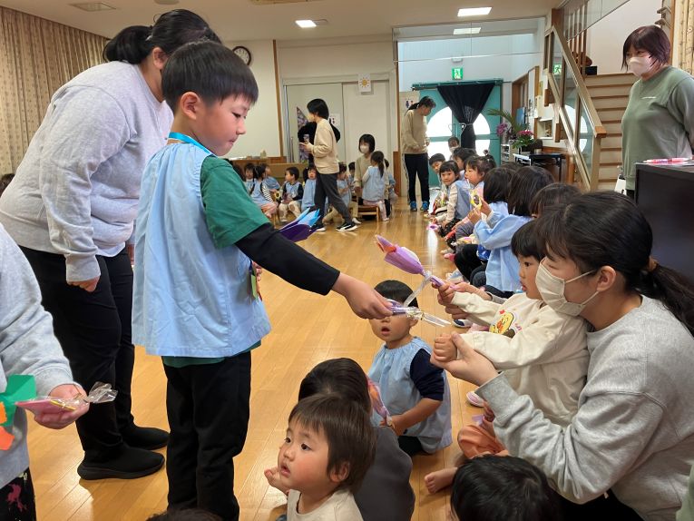 たくさん遊んでくれて、たくさんのことを教えてくれたお兄ちゃん、お姉ちゃんがもう卒園。たくさんの「ありがとう」の思いを込めてプレゼントを渡しました☺