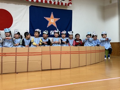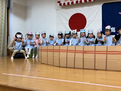 そして午後には、保護者の方に来てもらっての『おたのしみ会』。数日前から「後何回寝たらお父さん・お母さんが来てくれる」と楽しみに劇遊びやリズム遊び・歌を行ってきました。