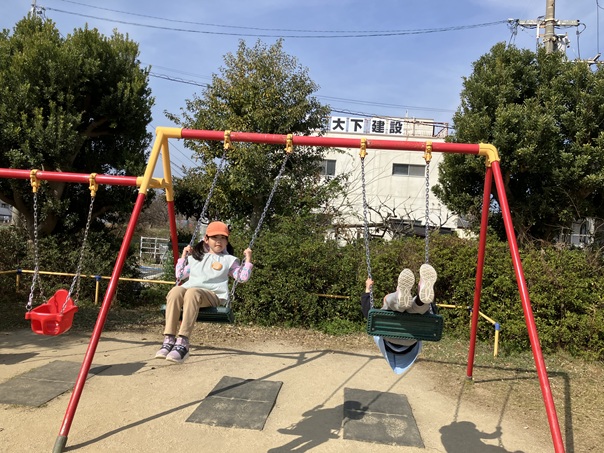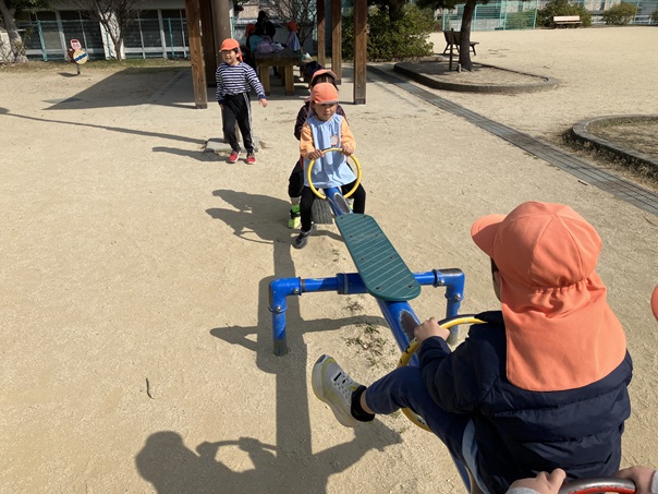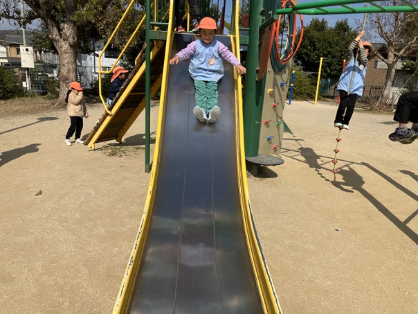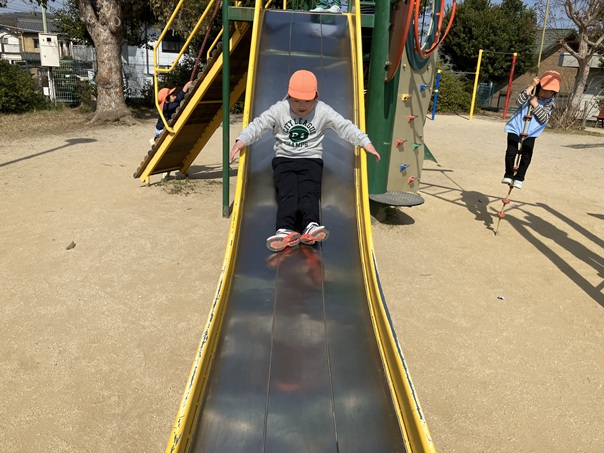 たくさん歩いて遊んで、「おなかすいたー!」とすぐに給食に向かいました。